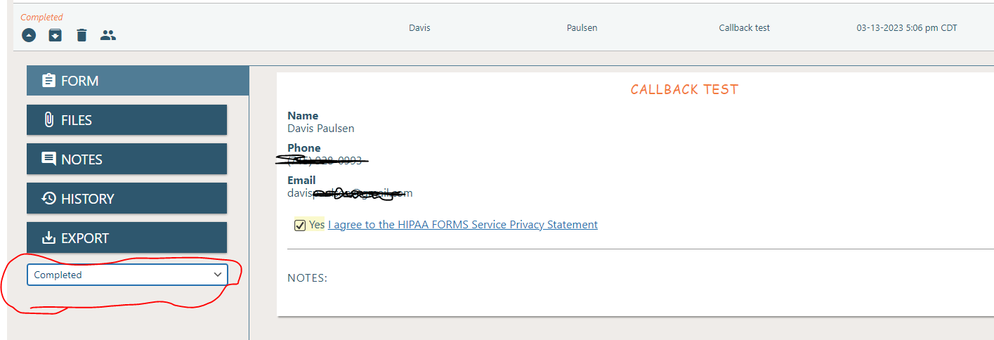 HIPAA Forms/Settings/Forms Status – Enable Status and add the needed status options for your forms. These status codes are available across all forms. Here is an example.