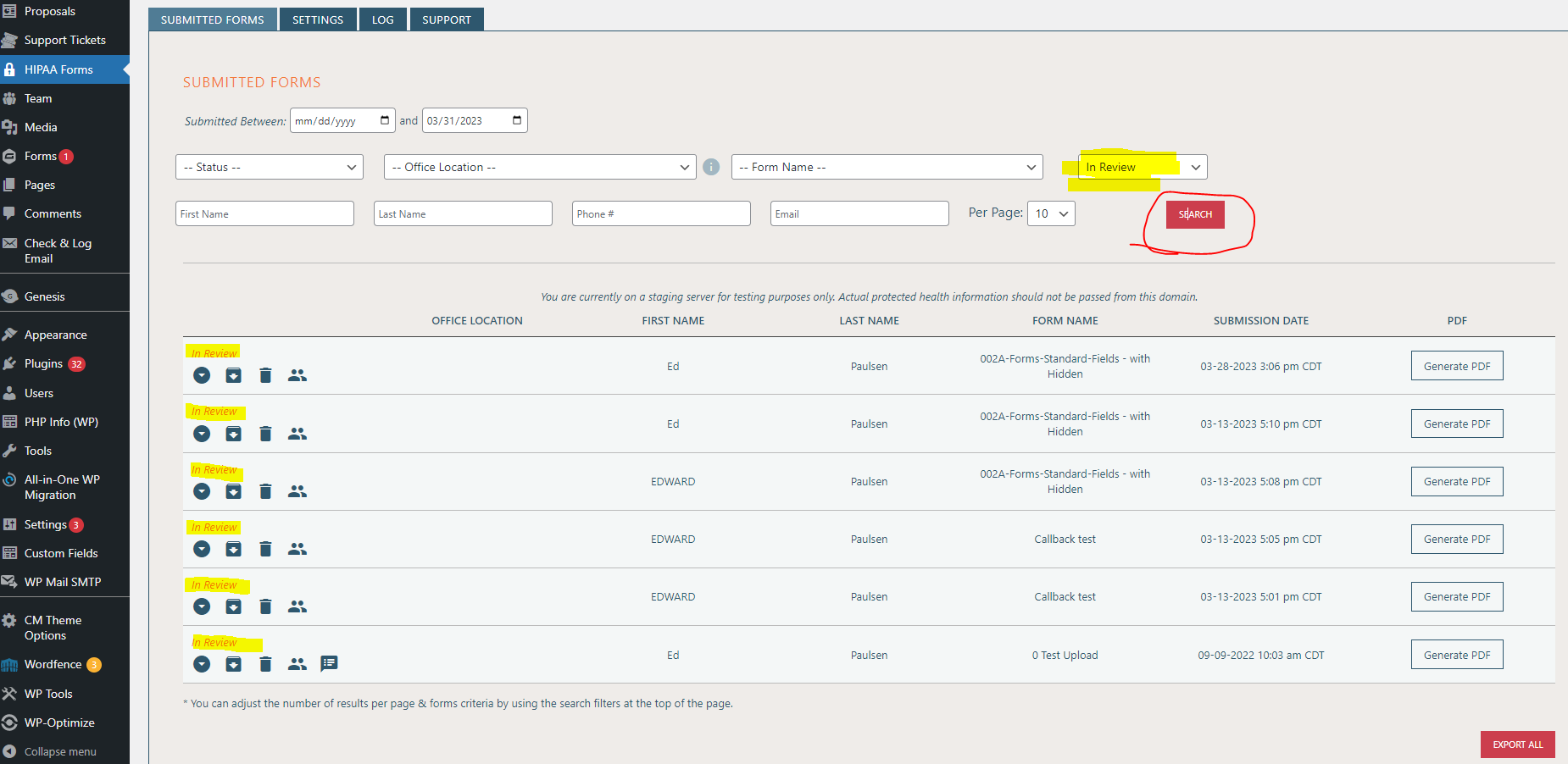 Finally, you can filter these status from the dashboard. By choosing one of the status codes and hitting search, a list of on the forms with that status will be listed: